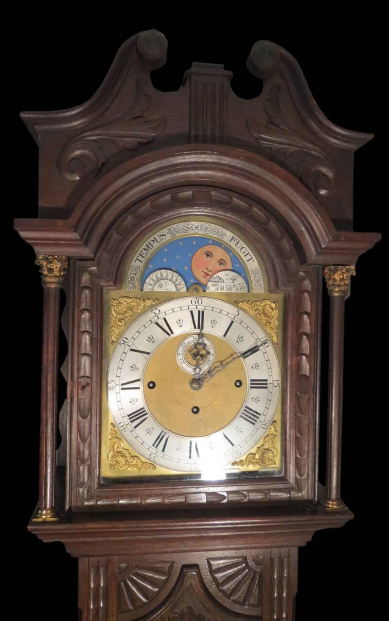 The longcase clock trade quickly spread to the provinces. Styles changed and often became distinctive to a certain region. The arch dial allowed clockmakers to add extra features to their clocks, moon-phases, automata etc. Longcase clocks generally became bigger as ceiling heights became higher. From around 1750 mahogany became available and quickly dominated for luxury clock cases. The ‘boom’ cities such as Manchester and Liverpool produced many excellent clockmakers who made large and impressive clocks for their wealthy clients. ‘Chippendale’ features became popular in Northern clocks. Clocks still had brass/ silvered dials, the style often became simpler and clearer towards the end of this period, lots of exceptions though! 12 inch dial width (plus arch) was most common but 13 inch started to be used more towards the end of this period.