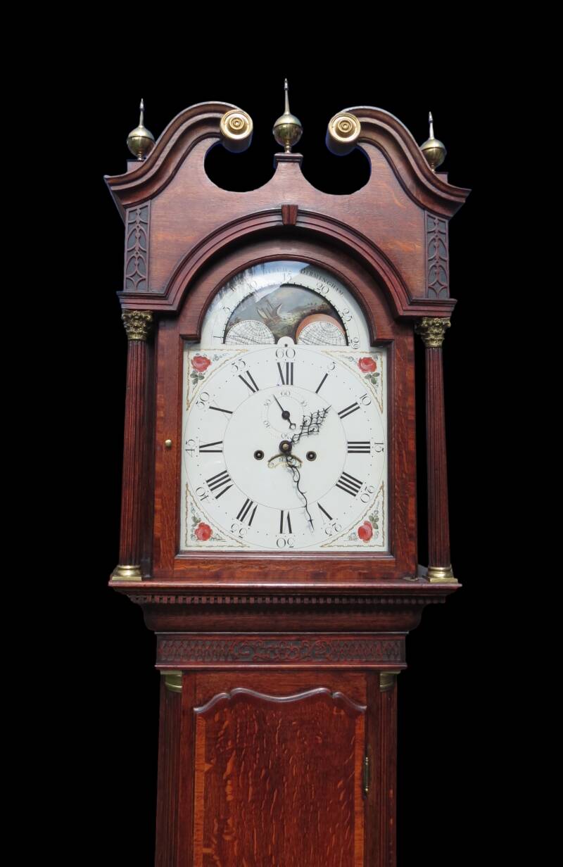 From around the mid 1770s ‘white’ or painted (japanned) dials became increasingly popular. James Wilson in partnership with Thomas Hadley Osborne started making these dials for clockmakers. This then became the dominant dial style for the next 100 years or so. Brass dials were still used, the final type of brass dial was a single sheet of silvered brass with engraved detail. White dials went through various styles, the earliest were copies of brass dials with decorated corner ‘spandrels’, 1790s often used pictures of flowers or fruits, by 1800 more elaborate pictures or geometric patterns. The 1800 to 1820 period is typified by Arabic numerals instead of Roman (there are exceptions). Although there are regional variances, case style tended to get bigger and wider in general, particularly after 1800. Dials also became bigger, 13 or 14 inch became more common.