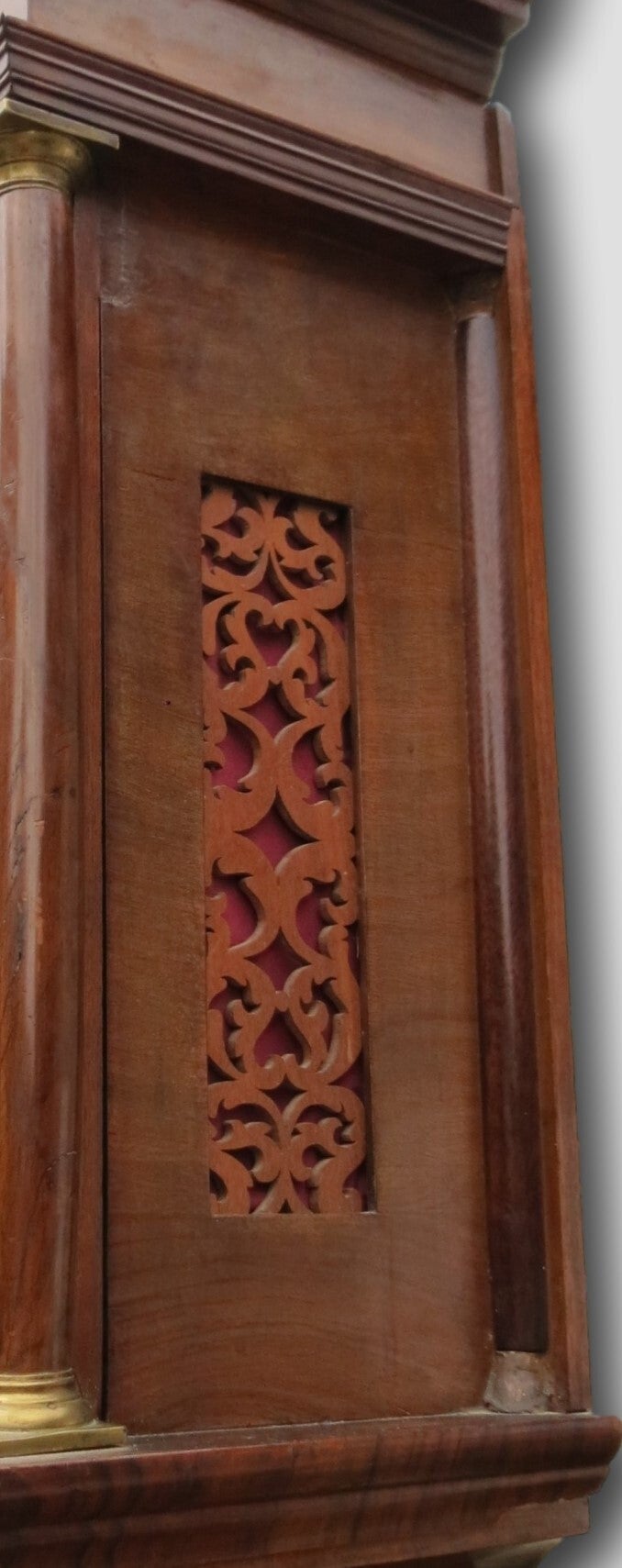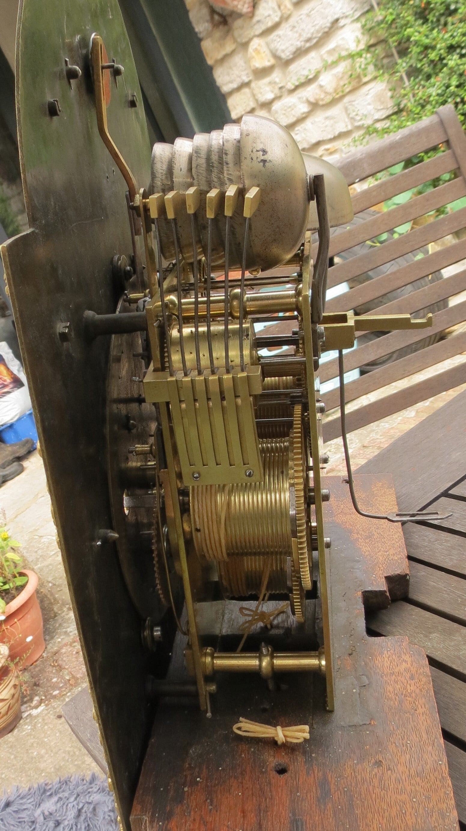 The quarter striking, three-train movement would have been a very luxurious item at the time. This one uses 6 bells and imitates the downward peal of church ringing. The quarters are differentiated by 1 peal at the first quarter, 2 at the second and so on. For the hour, 4 peals are sounded followed by the number of the hour on the strike train. Note that this is not really a ‘musical’ movement in that it does not play a tune. The strike/ silent lever in the arch silences both 6-bell and hourly strike functions.