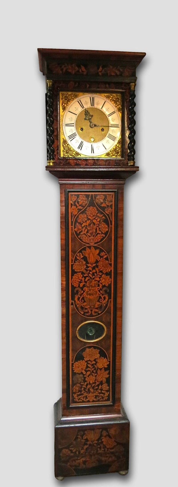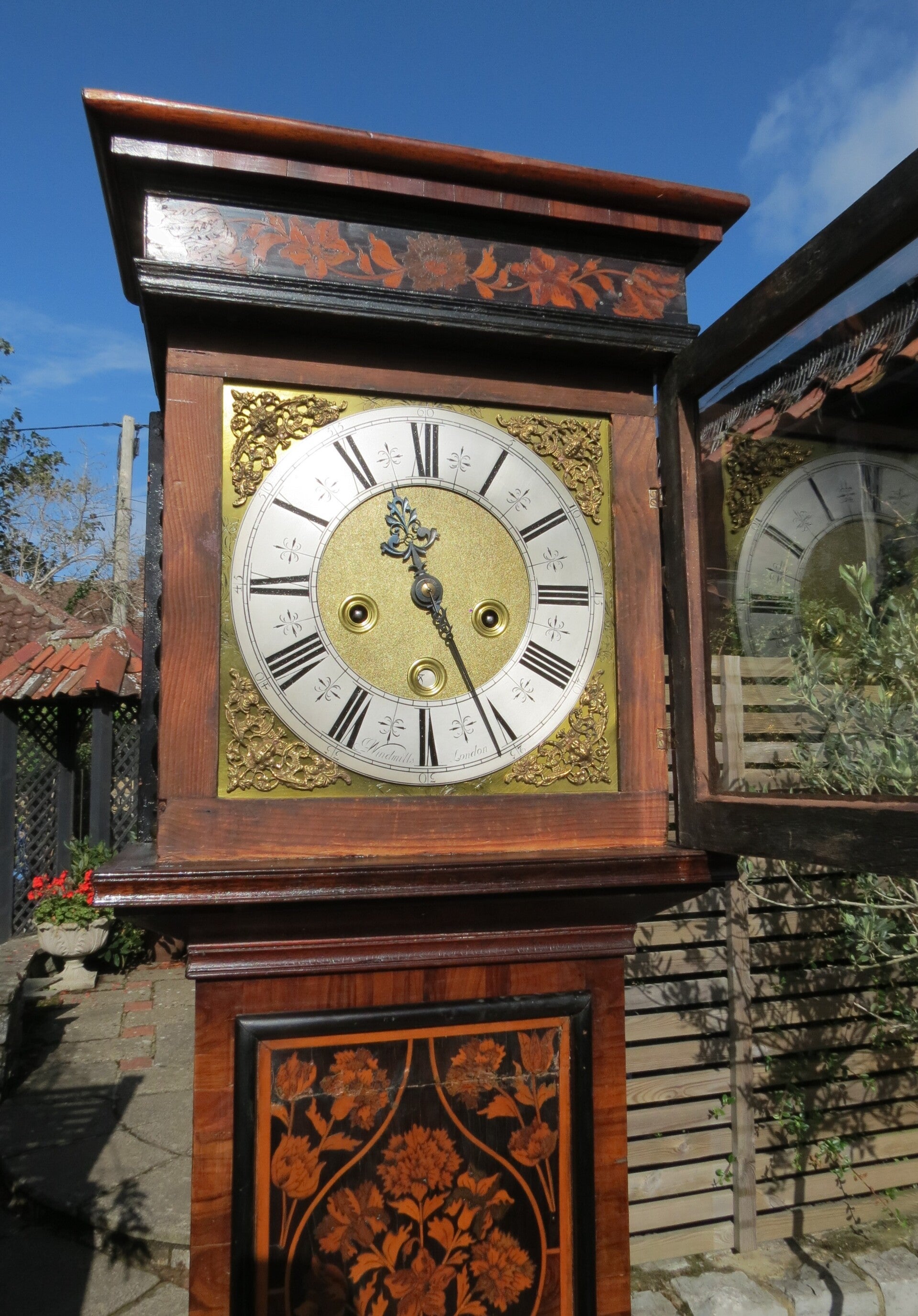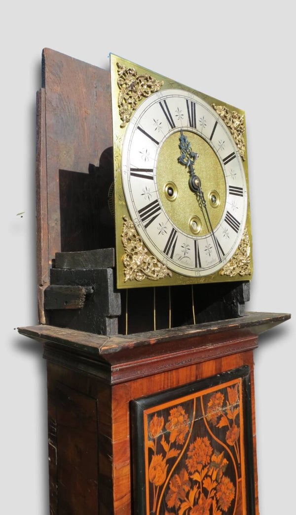 I would estimate this clock dates to around 1695, by this time the fashion for 8-day longcase clocks in London had progressed from the earlier smaller clocks generally with 10 inch dials, to slightly larger clocks mostly with 11 inch dials. The cases to house these fine (and very expensive!) movements were often marquetry, this in itself developed from earlier quite sparse decoration, through floral designs set out in panels (as this one), then ‘all-over decoration and eventually (beyond 1700) finer patterning described as ‘seaweed’ or ‘arabesque’.
