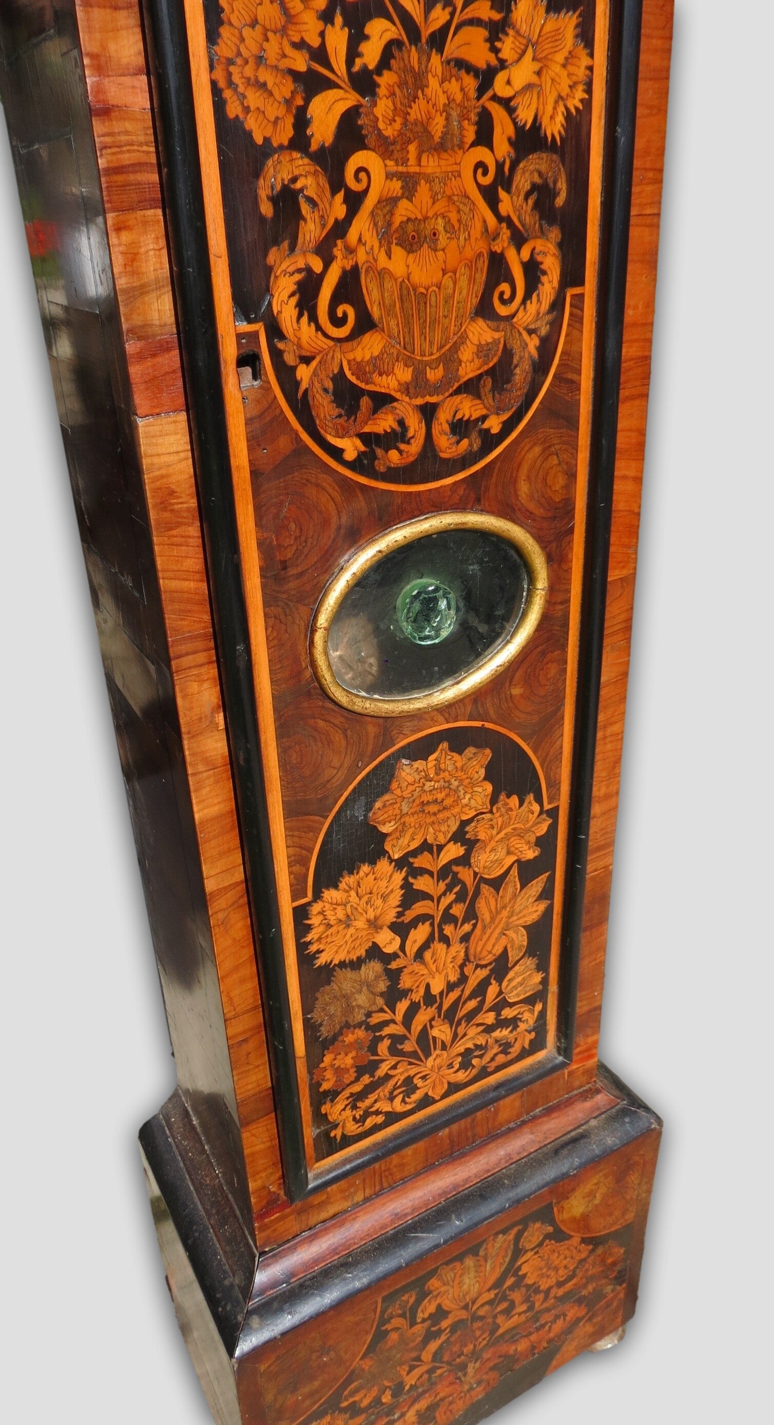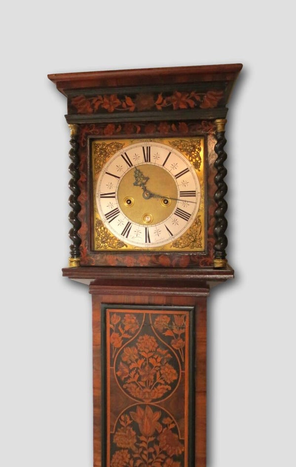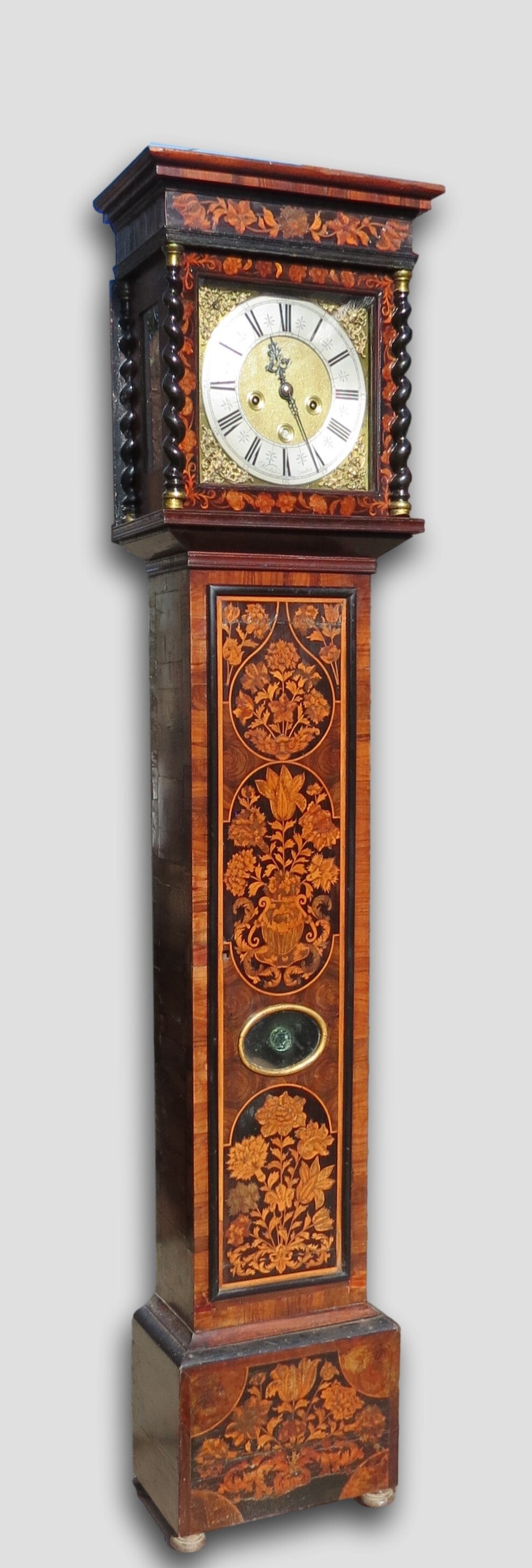Joseph Windmills London, a fine walnut and panelled floral marquetry longcase clock. Circa 1695, the 8-day movement with 6 latched pillars and inside countwheel strike. The 11 inch square dial with finely matted centre and date inset.