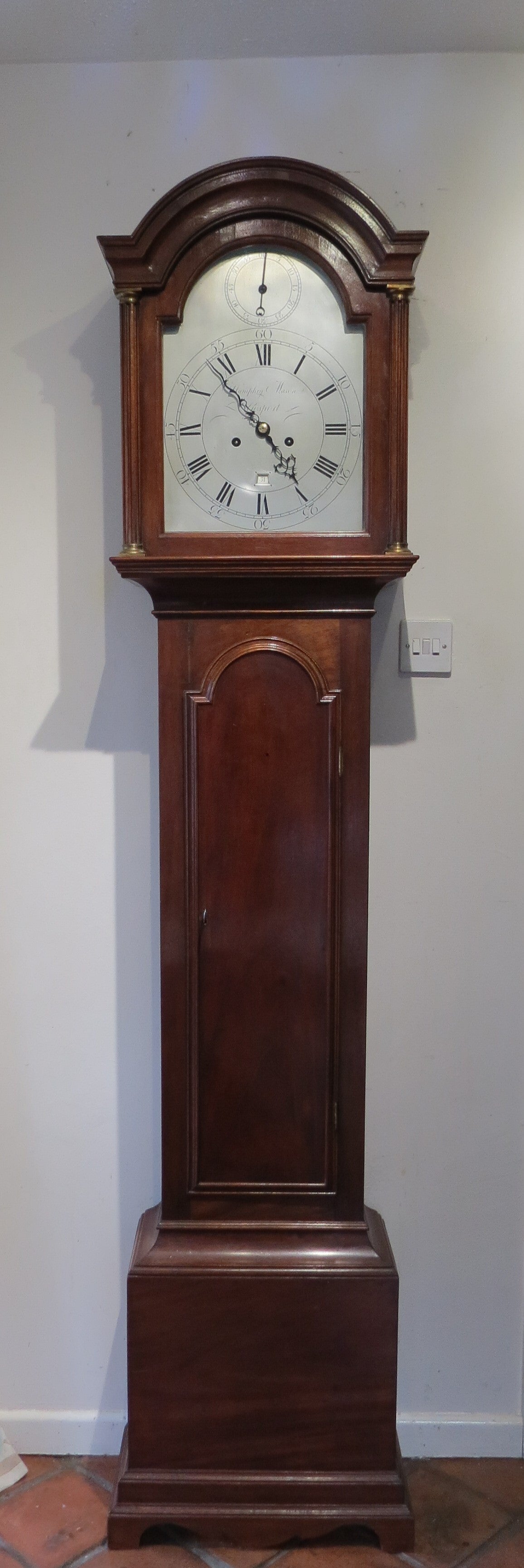 A very rare ‘arch seconds’ antique longcase clock, Humphry Mason Gosport, Circa 1800. The silvered brass dial with date inset. 8-day movement with 6 pillars and contrate wheelwork. Elegant and fairly compact mahogany case, brass cased weights.