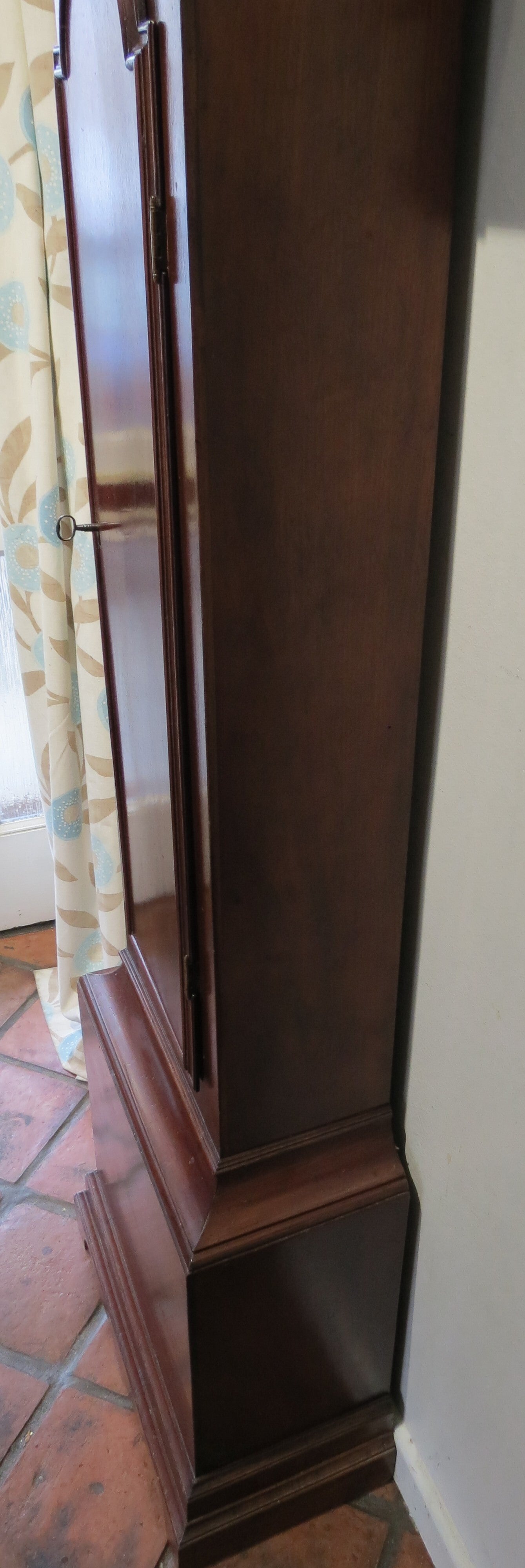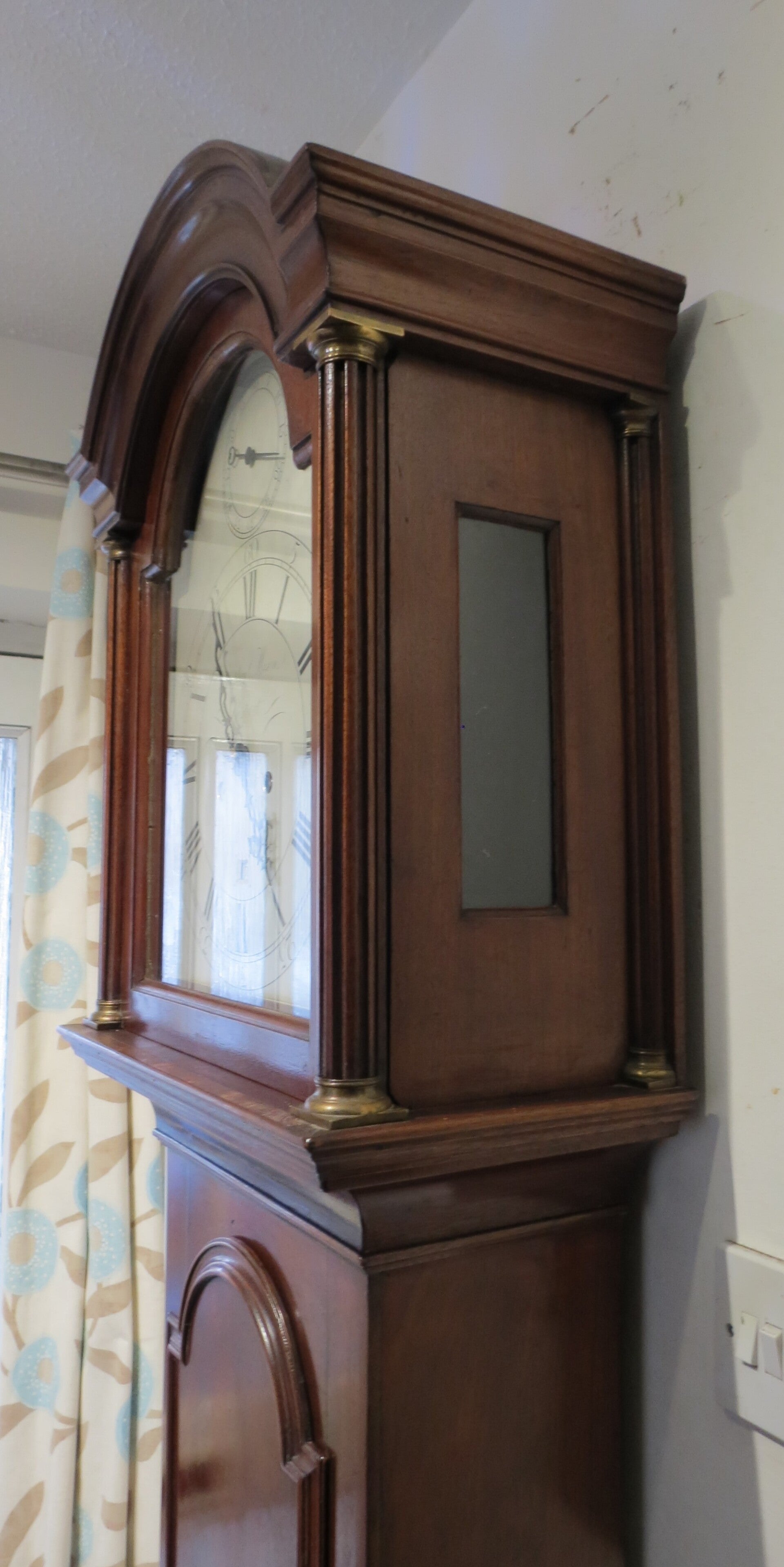 The clock overall has a particularly elegant appearance. This is partly down to the uncluttered silvered dial, also the case has slim and attractive proportions. The styling is fairly typical ‘south of London’ for this period, nice features including reeded hood pillars with brass capitals, also raised border around the long trunk door.