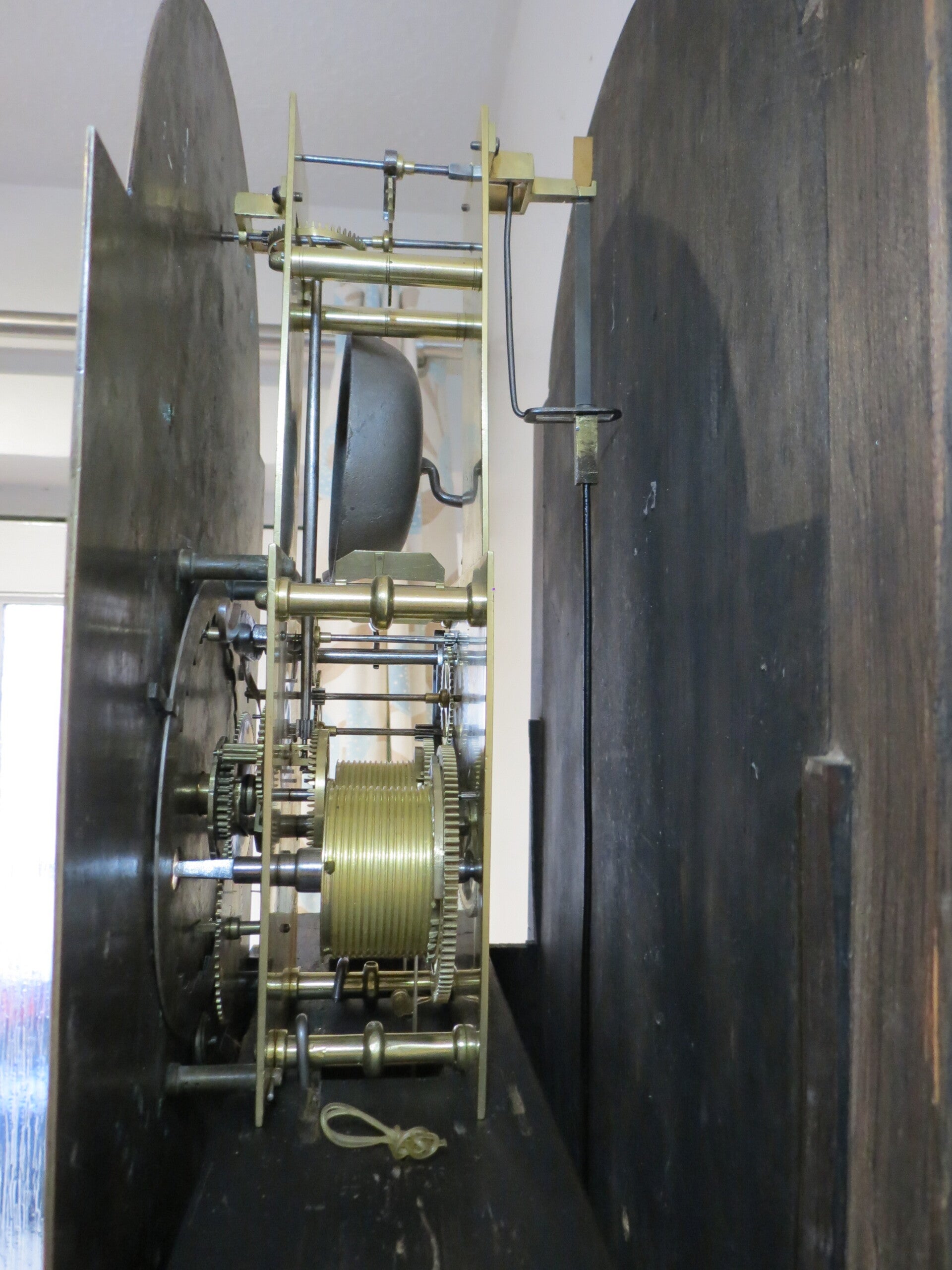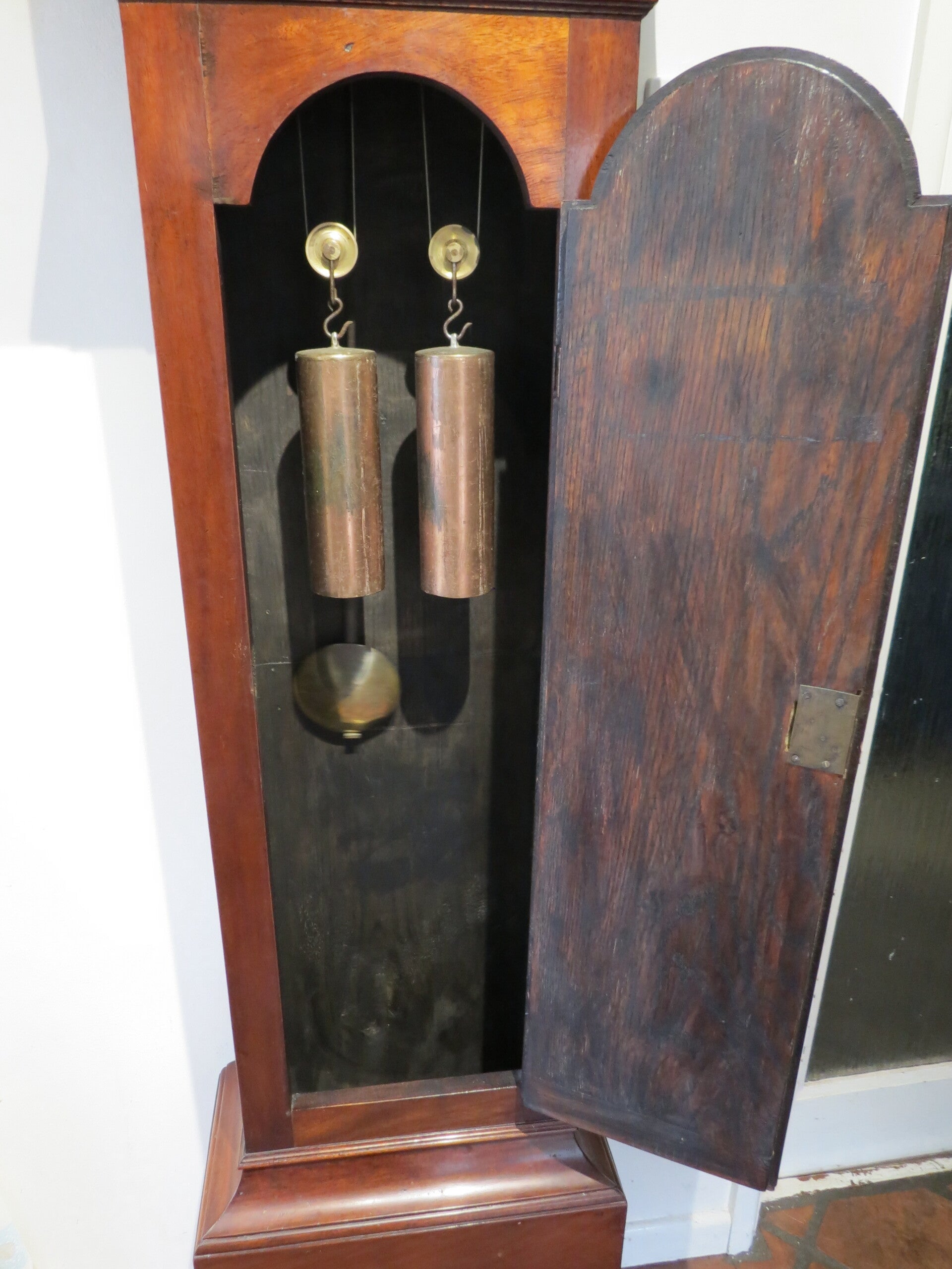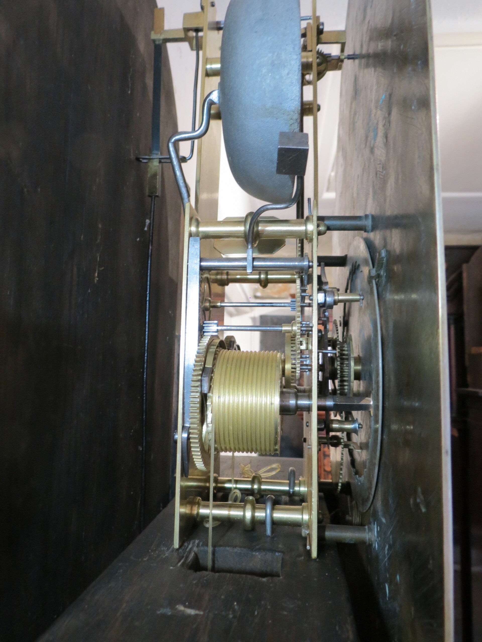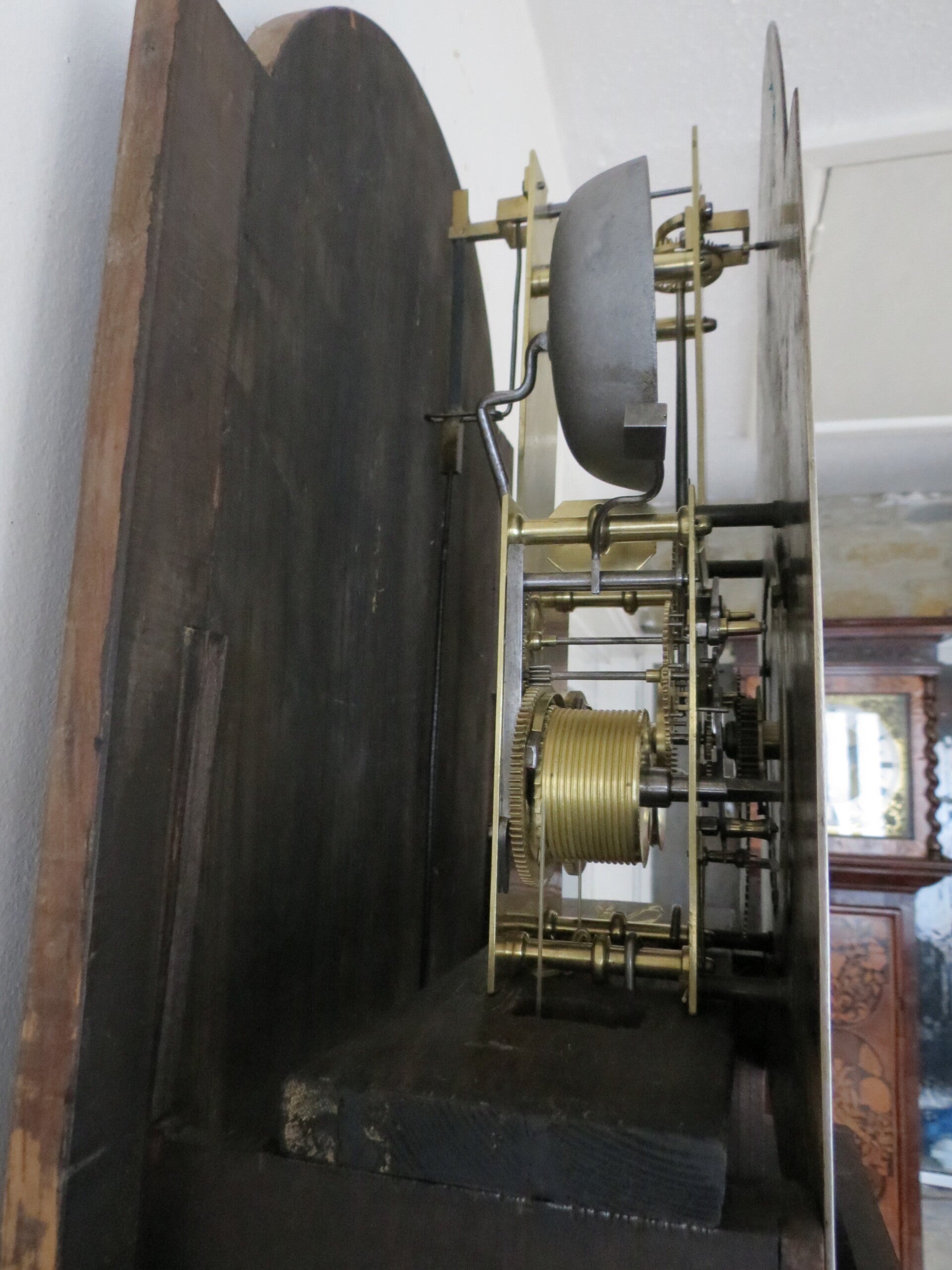 This type of clock showing the subsidiary seconds in the dial arch is very rare. This is because the movement is significantly more complicated than a normal 8-day clock. The plates have to be extended much higher to allow the seconds arbour to extend into the arch, also contrate wheelwork is required to drive the long vertical arbour and then re-convert back to horizontal for the seconds hand. Also note that the winding barrels have to be narrower to allow extra room for the contrate drive, as a consequence the gearing is slightly different and the weight drop slightly less than a normal 8-day clock.