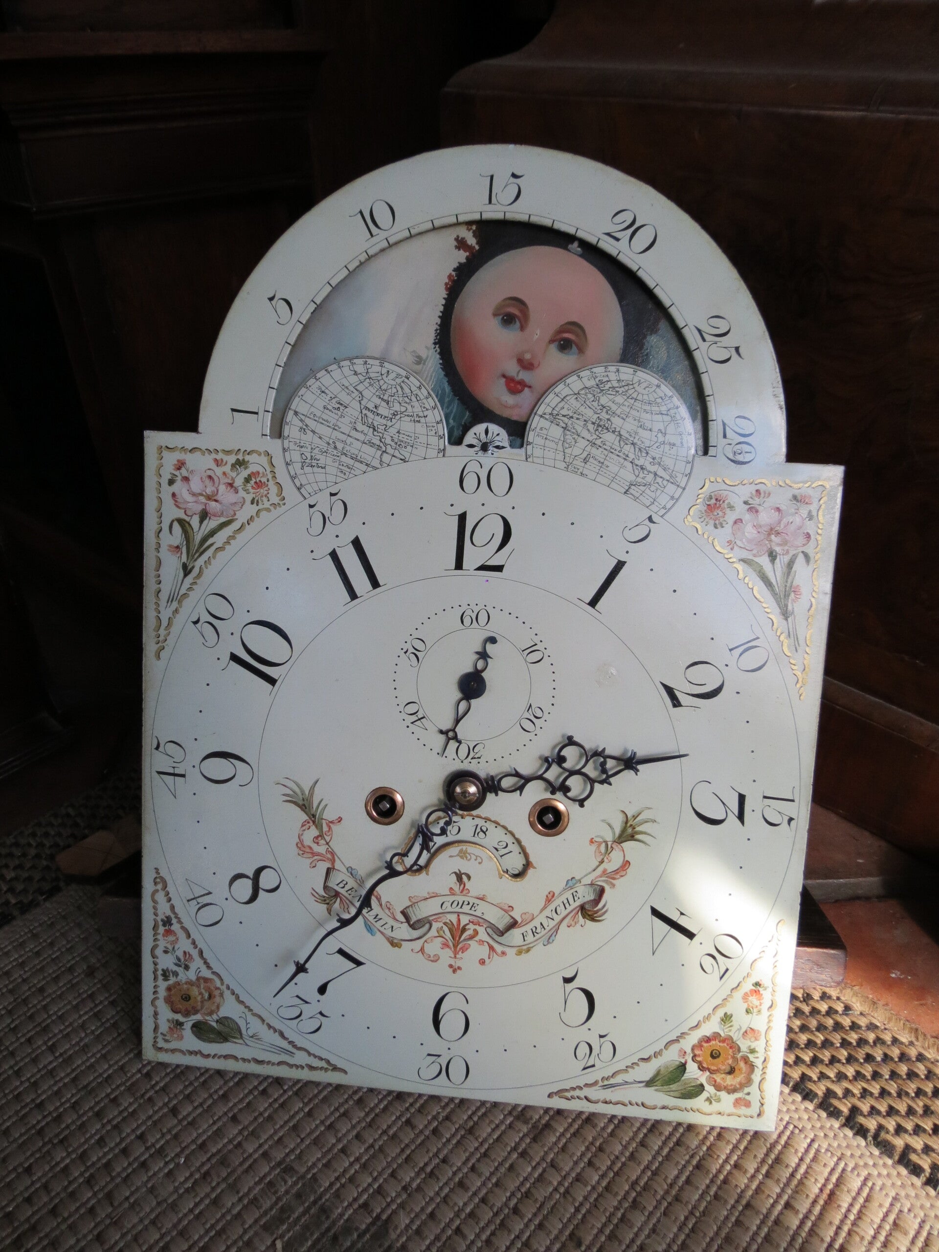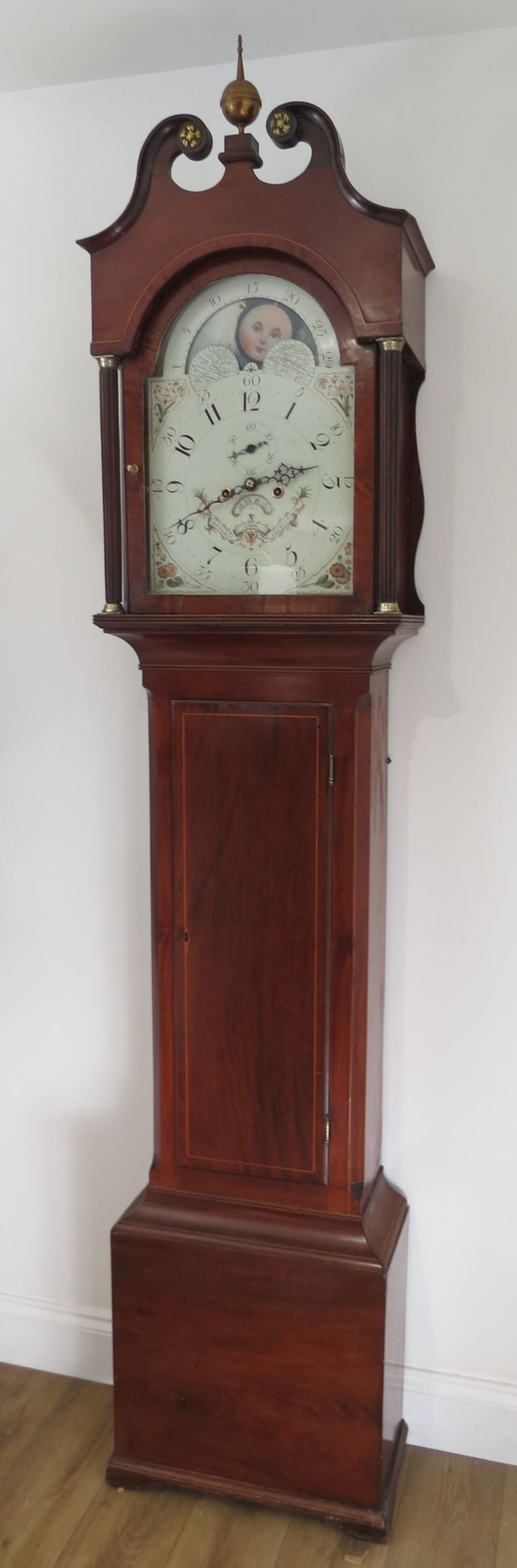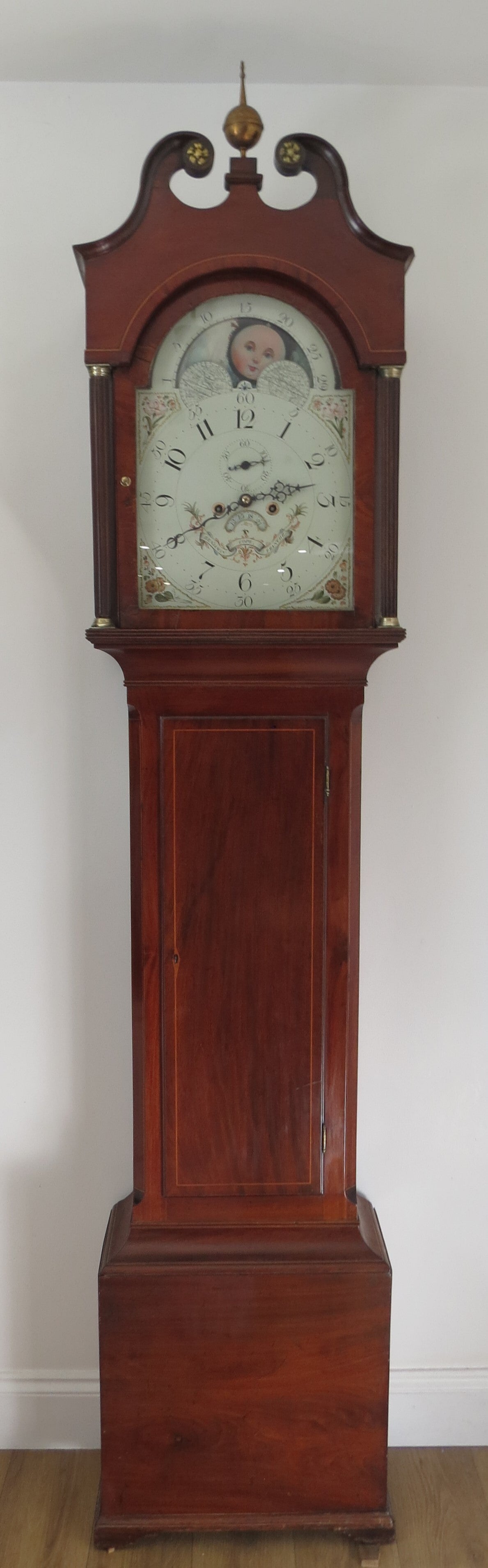 One of the nicest painted dials you will find! Wilson dial dating to around 1800. Beautiful portayal of painted moon faces, ship at sea and rural scene to moon-disk. The main dial has floral themes to the corners and further embellishments to the centre incorporating the maker's name.