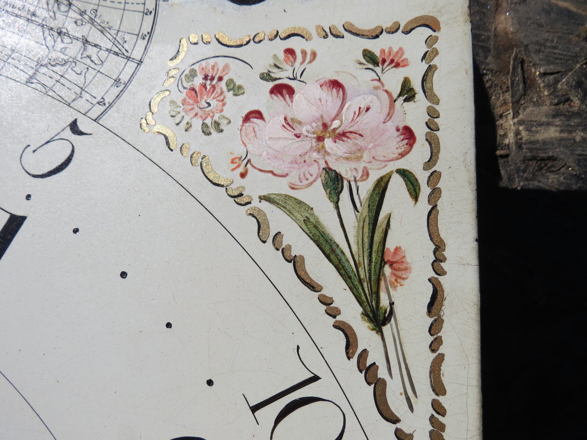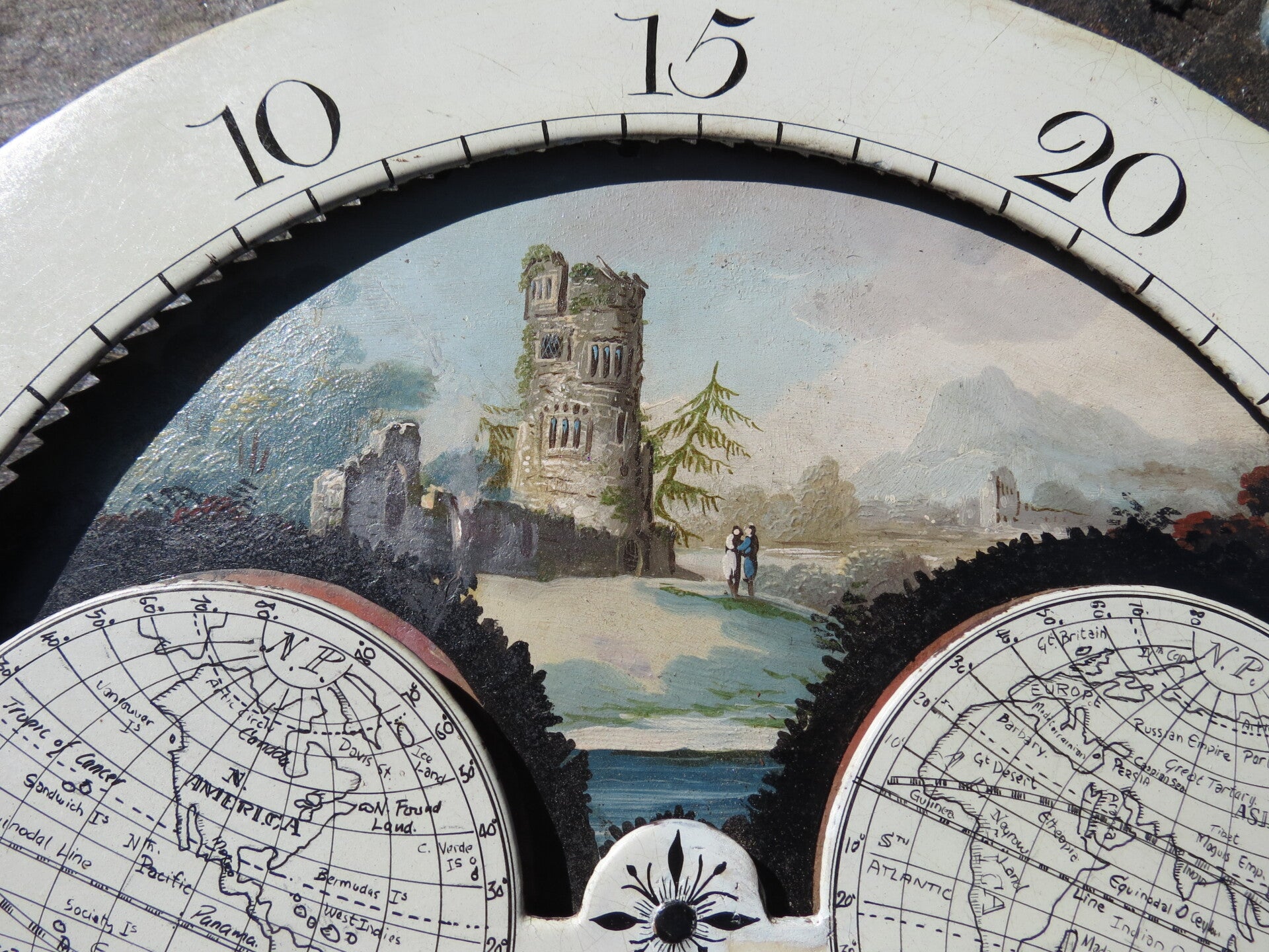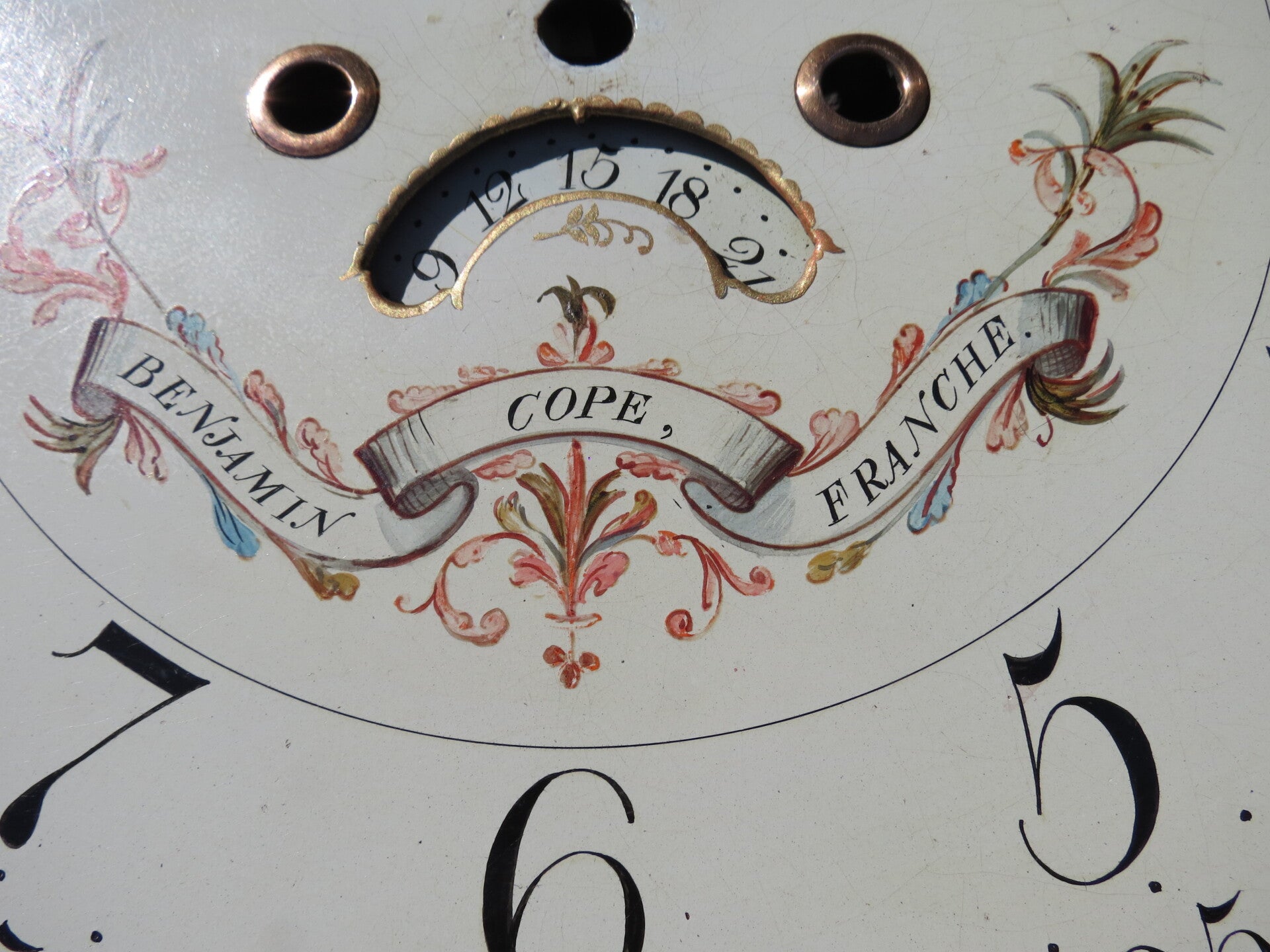 One of the nicest painted dials you will find! Wilson dial dating to around 1800. Beautiful portayal of painted moon faces, ship at sea and rural scene to moon-disk. The main dial has floral themes to the corners and further embellishments to the centre incorporating the maker's name.