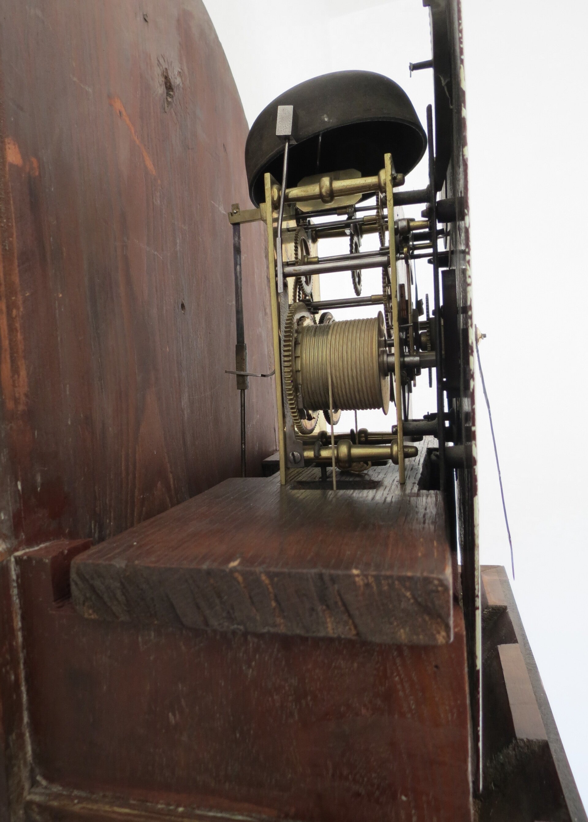 Good, well proportioned mahogany case with some older repairs to hood door (not visible when closed). Some splitting to the lower left trunk and base, not too bad.